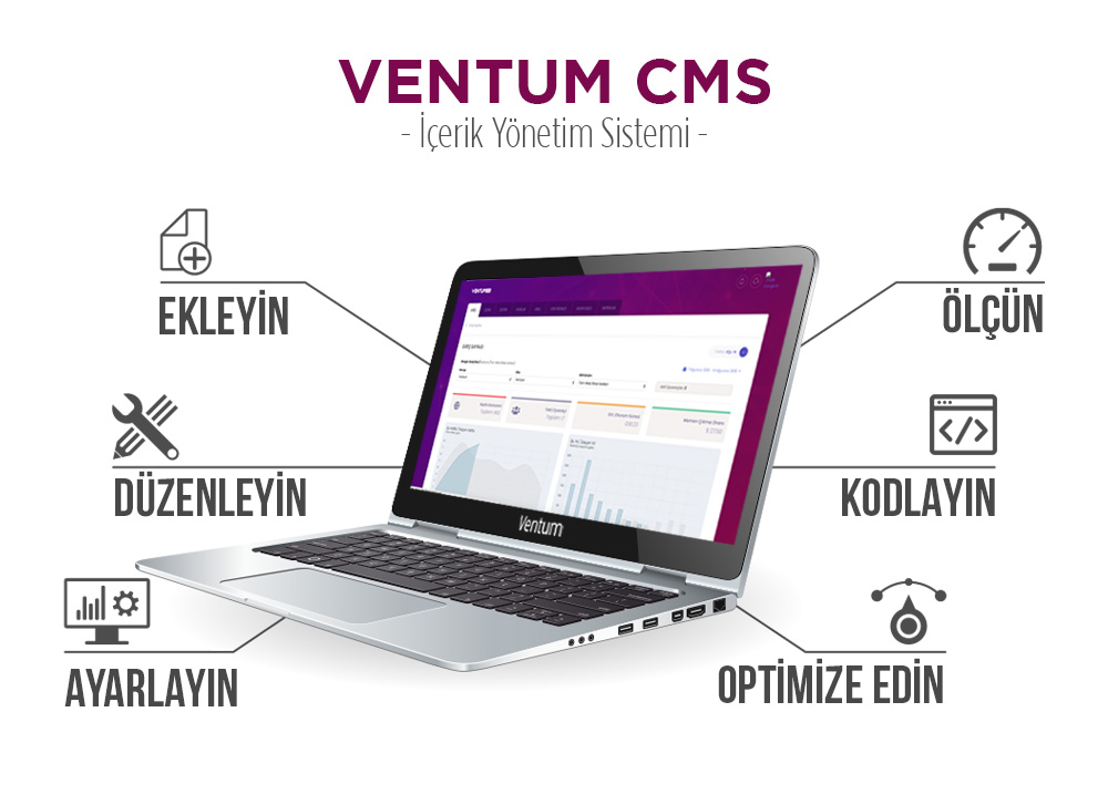 * Ventum CMS kullanıcı tavsiyeleri ve yazılım alanındaki de facto gelişmelerle zenginleştirilen, çoklu dil altyapısına sahip kullanıcı ve arama motoru dostu bir içerik yönetim sistemidir. İçerdiği çoklu dil destekli opsiyonel SEO ve SMO modülleri ile arama sonuçlarında yükselmenize etkin bir şekilde katkıda bulunur. Web sitenizle ilgili birçok düzenlemeyi kimseye ihtiyaç duymadan gerçekleştirmenizi sağlar.