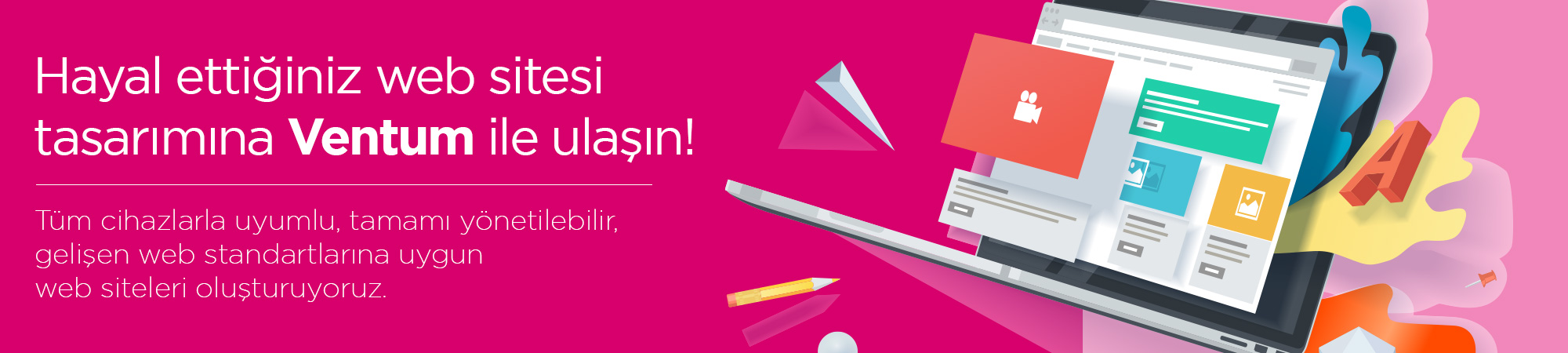 Gelişen dijital dünyada Web Siteniz pazarlama süreçlerinizin en önemli süreçlerinden biri olarak yerini alıyor. Web sitenizi ziyaret eden kullanıcılar, sitenizin teknik açıdan kusursuz, estetik olarak mükemmel olmasını bekliyorlar. Ventum, tasarım, kulanıcı deneyimini en üst düzeyde tutarak keyifli web ziyaretçilerinizin bilgiye kolayca ve keyifli ulaşabilecekleri web siteleri hazırlıyoruz.